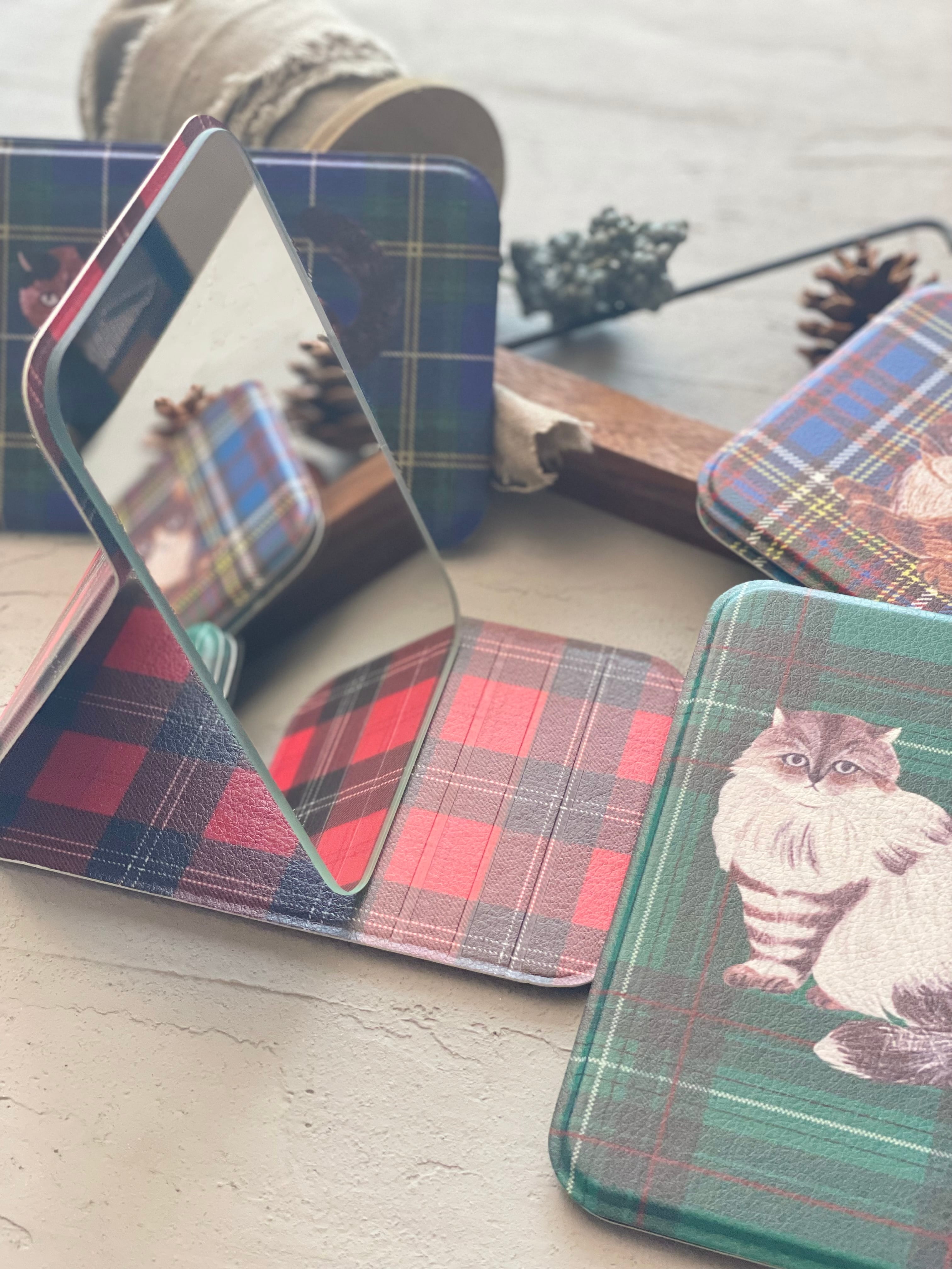 リラックスした表情のネコたちとタータンチェック柄がおしゃれ♬